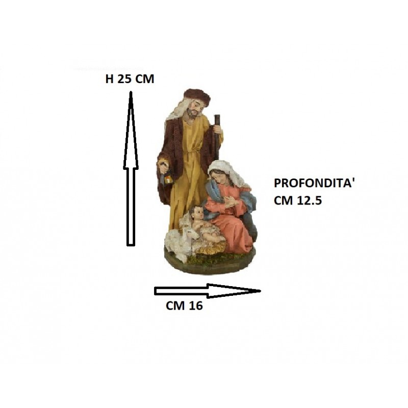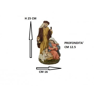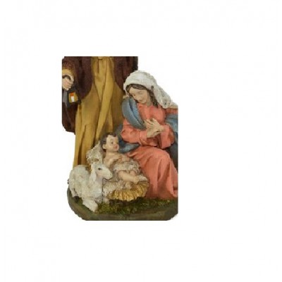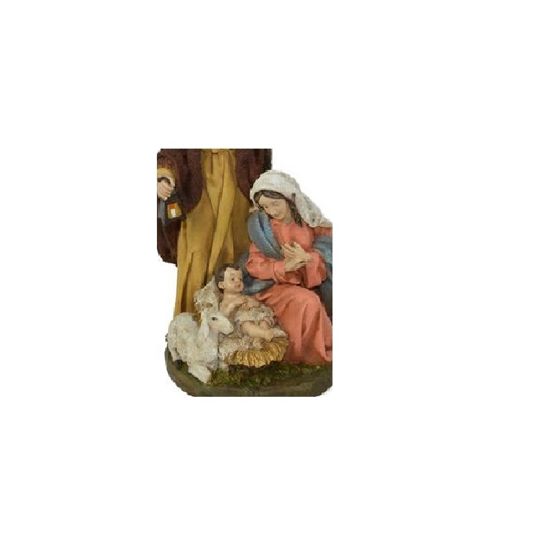 Realizzato in resistente vetroresina, questo presepe include la Sacra Famiglia (Gesù, Maria, Giuseppe)
