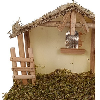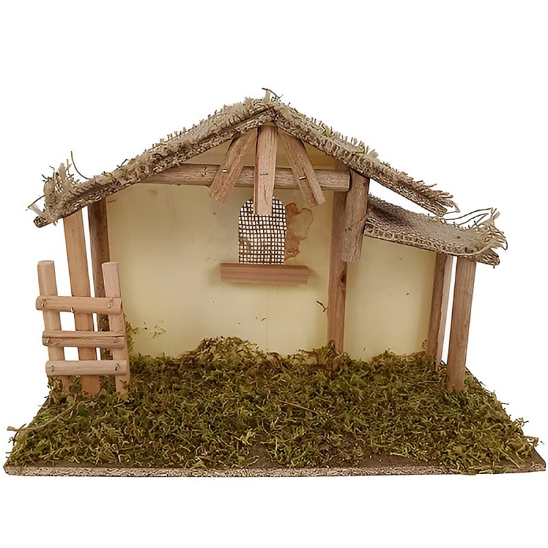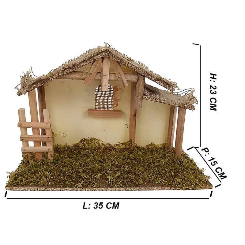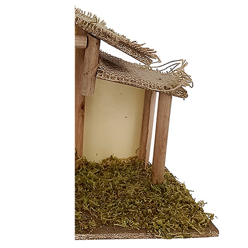 Il tetto della capanna è ricoperto da juta grezza, con inserti di muschio naturale, che donano un effetto visivo rustico, perfetto per ricreare l’atmosfera della grotta o stalla dove nacque il Bambin Gesù. Il retro è arricchito da una finestra aperta che aggiunge profondità, mentre una scala in legno laterale offre un tocco decorativo distintivo e suggestivo.