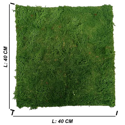 Con le sue dimensioni di 40 x 40 cm, questo tappeto è realizzato in lichene stabilizzato di colore verde, applicato su una base adesiva che permette una facile applicazione su superfici lisce e porose.