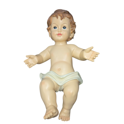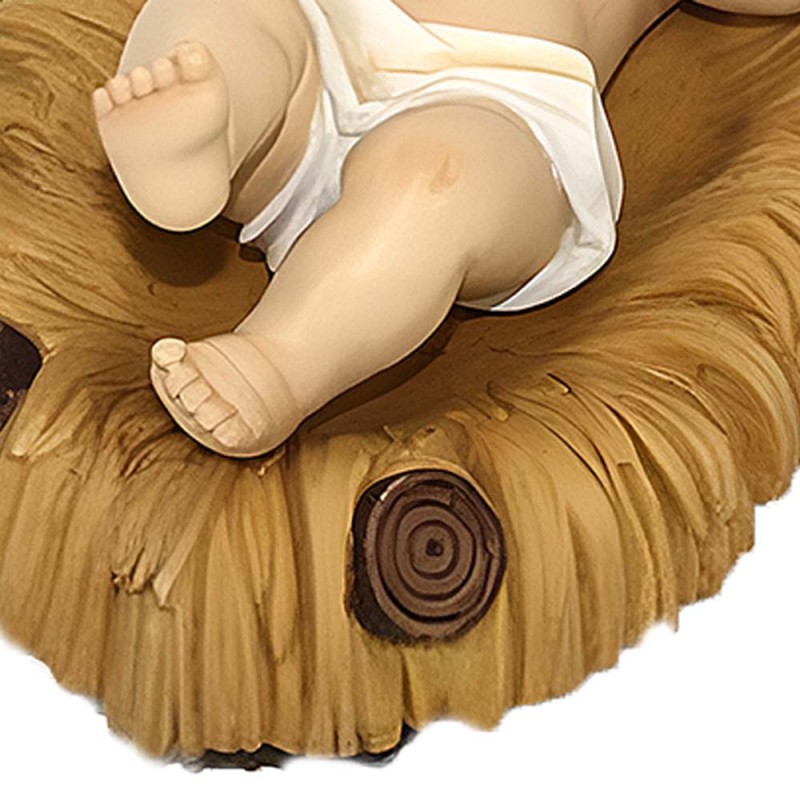 Il Bambinello è realizzato in resina resistente, con finitura effetto ceramica e culletta in finta paglia che aggiunge realismo e calore alla scena.