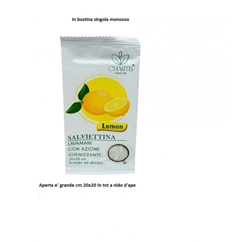 COSEDACASA Vi propone salviettine igienizzanti per le mani in tessuto TNT a nido d’ape, al profumo fresco di limone, misura 20×20 cm, singolarmente imbustate, confezione da 50 pz in display cartonato, ideali per ristoranti, laboratori e uso professionale. Ogni salvietta: