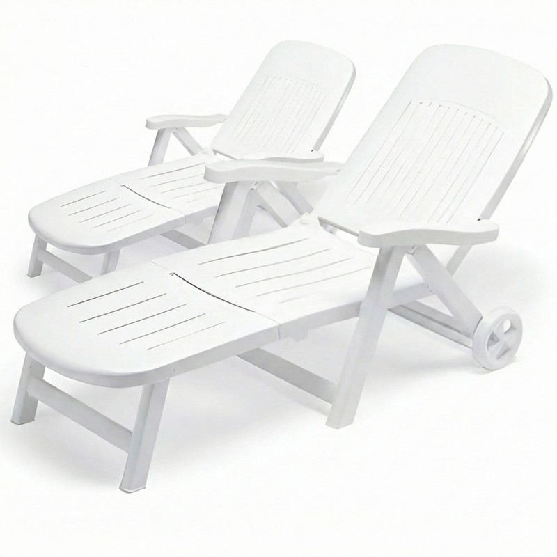 Set di 2 lettini da sole S-CAB California è la scelta ideale per chi cerca comfort e praticità. Con schienale reclinabile in 5 posizioni, ruote per un facile spostamento e design pieghevole, è perfetto per giardini, terrazzi e piscine. Realizzato in resina di alta qualità, è resistente agli agenti atmosferici e facile da pulire. Disponibile nel colore bianco, misura 190 cm di lunghezza, 80 cm di larghezza e 98 cm di altezza.