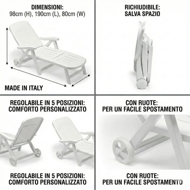Il lettino da sole S-CAB California è la scelta ideale per chi cerca comfort e praticità. Con schienale reclinabile in 5 posizioni, ruote per un facile spostamento e design pieghevole, è perfetto per giardini, terrazzi e piscine. Realizzato in resina di alta qualità, è resistente agli agenti atmosferici e facile da pulire. Disponibile nel colore bianco, misura 190 cm di lunghezza, 80 cm di larghezza e 98 cm di altezza.