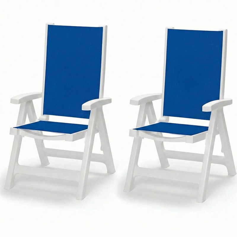 Questa poltrona Esmeralda Tex di Sca-b Design presenta un telaio bianco in tecnopolimero di alta qualità e una seduta in tessuto tex blu traspirante e idrorepellente. Con misure di 62x68x110 cm, offre 5 diverse regolazioni dello schienale per un relax personalizzato ed è completamente richiudibile.Il prezzo e' riferito alla COPPIA di Poltrone