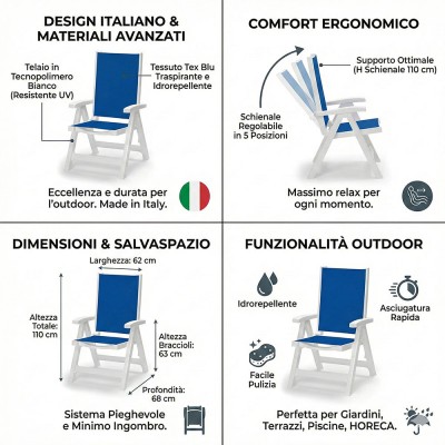 Il punto di forza di questo modello è lo schienale ergonomico, regolabile in ben 5 posizioni diverse, che permette di passare rapidamente dalla modalità lettura a quella relax totale. La seduta e lo schienale sono realizzati in tessuto tex blu: una fibra tecnologica traspirante che previene l'accumulo di calore sulla pelle e risulta completamente idrorepellente, facilitando un'asciugatura rapida dopo piogge o esposizione all'umidità.