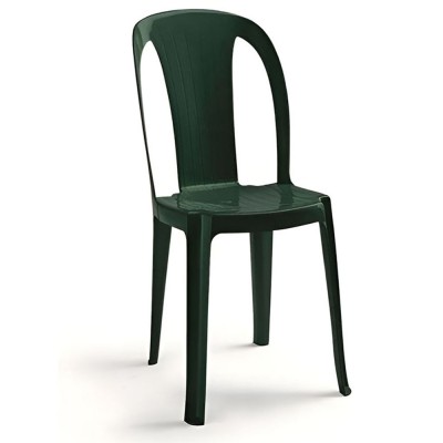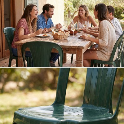 Realizzata in polipropilene (resina di sintesi) riciclabile, la sedia è progettata per resistere agli agenti atmosferici e mantenere un aspetto impeccabile nel tempo grazie a speciali trattamenti anti-UV. La finitura color verde bosco offre una tonalità neutra e raffinata, capace di integrarsi armoniosamente in giardini, terrazze o ambienti interni moderni.