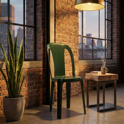 Realizzata in polipropilene (resina di sintesi) riciclabile, la sedia è progettata per resistere agli agenti atmosferici e mantenere un aspetto impeccabile nel tempo grazie a speciali trattamenti anti-UV. La finitura color verde bosco offre una tonalità neutra e raffinata, capace di integrarsi armoniosamente in giardini, terrazze o ambienti interni moderni.