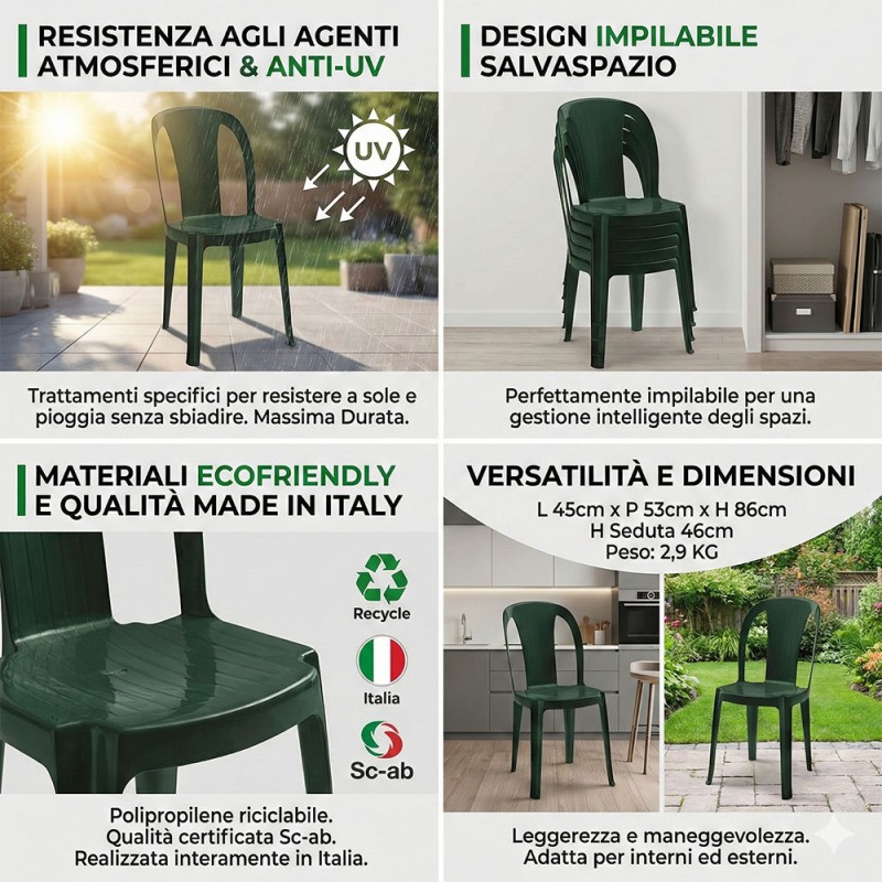 Cose da Casa vi propone soluzioni intelligenti e di stile, pensate per chi non vuole rinunciare alla bellezza nella propria quotidianità. Il set da 4 : Questa sedia monoblocco modello Tiuana di Sca-b è realizzata in poliresina di alta qualità color verde bosco. Leggera (solo 2,9 kg) ma estremamente robusta, vanta dimensioni di 45x53x86 cm ed è completamente impilabile per ottimizzare ogni spazio. Un complemento d’arredo versatile che unisce la resistenza dei materiali tecnici all'eleganza del design italiano.Se ordinato entro le 13:00 spediremo lo stesso giorno con codice tracking del corriere e consegna entro 48 ore (se il corriere non ha intoppi).
