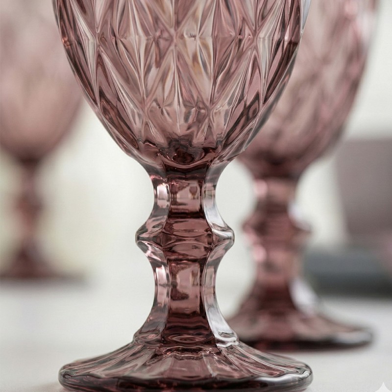 La lavorazione superficiale a diamante non solo crea splendidi giochi di luce che impreziosiscono l'atmosfera del pasto, ma garantisce anche una presa solida ed ergonomica. La struttura solida del gambo e della base assicura stabilità, rendendo questi calici perfetti sia per cene formali che per pranzi in famiglia. Grazie alla tonalità rosa sofisticata, si abbinano armoniosamente a tovaglie neutre o ad altri elementi colorati, offrendo versatilità stilistica in ogni occasione.