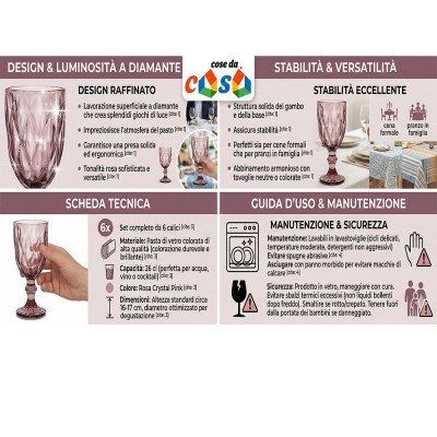 Cose da Casa vi propone soluzioni intelligenti e di stile, pensate per chi non vuole rinunciare alla bellezza nella propria quotidianità. Questo set comprende 6 calici in pregiata pasta di vetro color rosa Crystal Pink con una capacità di 26 cl ciascuno. Caratterizzati da una raffinata lavorazione geometrica a rilievo, uniscono un design vintage a una robustezza ideale per l'uso quotidiano. Perfetti per servire acqua e vino, aggiungono un tocco di colore e classe a ogni mise en place.Se ordinato entro le 13:00 spediremo lo stesso giorno con codice tracking del corriere e consegna entro 48 ore (se il corriere non ha intoppi).