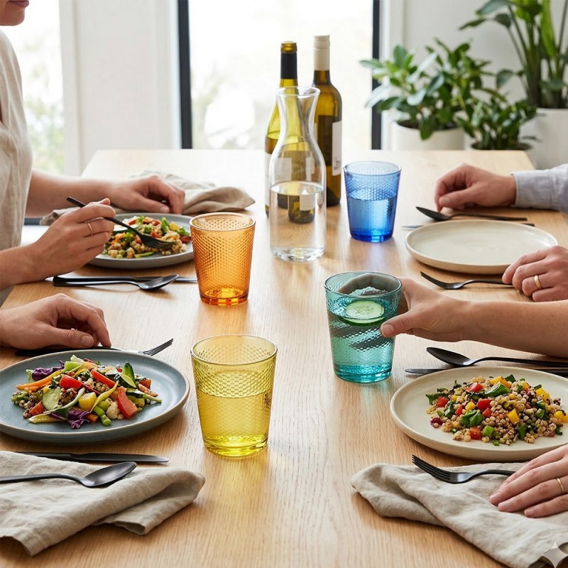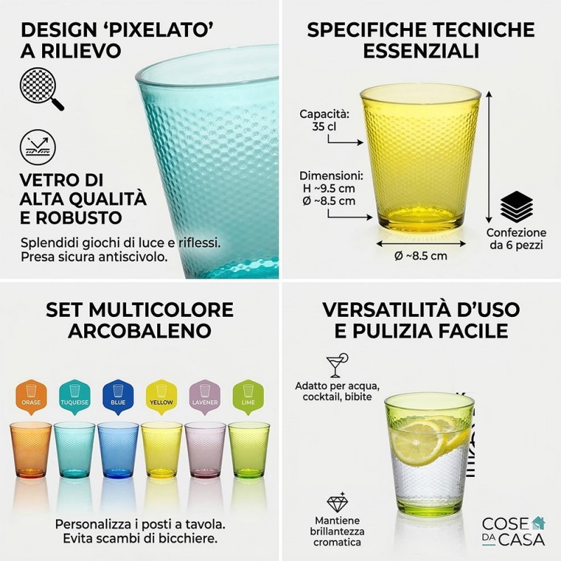 Cose da casa vi propone la linea Pixel, una collezione di bicchieri in vetro progettata per chi ama coniugare estetica e funzionalità. Questo set arcobaleno non è solo un accessorio per la tavola, ma un vero elemento d'arredo capace di trasformare ogni pasto in un'occasione speciale.