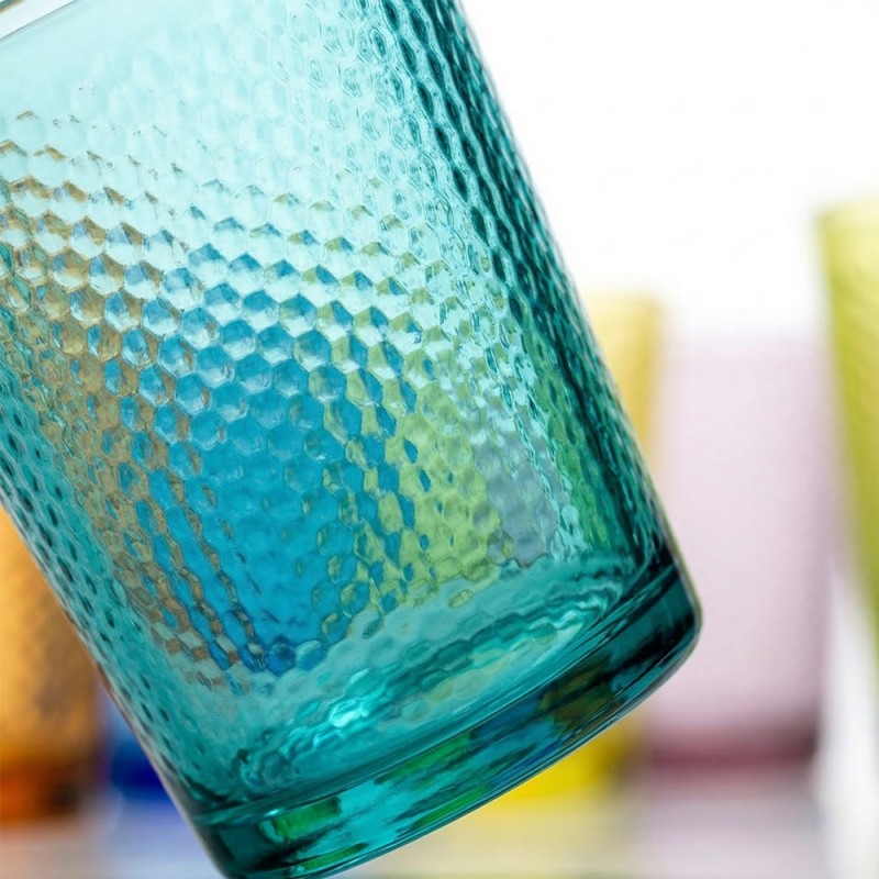 Realizzati in vetro robusto e trasparente, i bicchieri presentano una particolare lavorazione esterna "pixelata" che crea splendidi giochi di luce e riflessi. La qualità costruttiva assicura una resistenza eccellente all'uso quotidiano e ai lavaggi frequenti, mantenendo inalterata la brillantezza dei colori nel tempo. La forma ergonomica e la superficie materica offrono un'esperienza d'uso superiore e una stabilità ottimale.