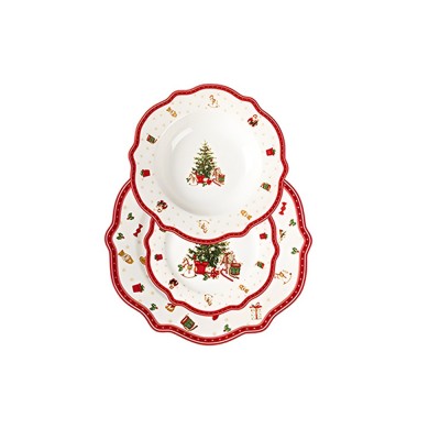 Ogni piatto è decorato con un festoso motivo natalizio: in porcellana bordi smerlati decorazioni di natale per una tavola particolare ed elegante idea regalo e dettagli colorati che rendono ogni pezzo unico e suggestivo.