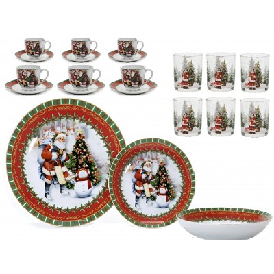 Set tavola natalizio completo da 36 pezzi per 6 persone, composto da: 18 piatti in porcellana (6 piani Ø 26.7 cm, 6 fondi Ø 20.3 cm, 6 frutta Ø 19.1 cm), 6 tazzine da caffè in porcellana capienti 9 cl con 6 piattini abbinati, e 6 bicchieri in vetro trasparente da 25 cl (D 8 cm, H 7.5 cm). Tutti i pezzi presentano decorazioni natalizie con Babbo Natale, pupazzo di neve, albero addobbato e agrifoglio, per una tavola festiva ed elegante. Materiali: porcellana di alta qualità e vetro sicuro per uso alimentare. I bicchieri sono prodotti in Italia e lavabili in lavastoviglie. Non adatti al microonde. Il set arriva in scatola regalo, perfetto per fare bella figura durante le feste o da donare.
