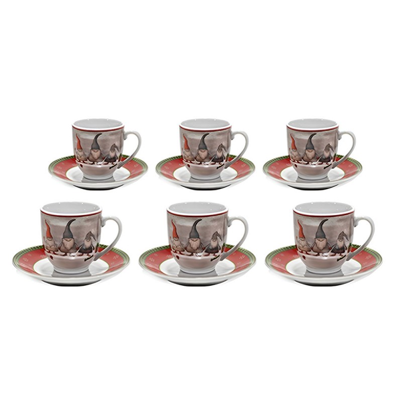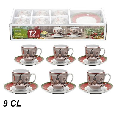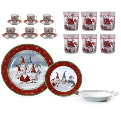 Set tavola natalizio completo da 36 pezzi per 6 persone, composto da: 18 piatti in porcellana (6 piani Ø 26.7 cm, 6 fondi Ø 20.3 cm, 6 frutta Ø 19.1 cm), 6 tazzine da caffè in porcellana capienti 9 cl con 6 piattini abbinati, e 6 bicchieri in vetro trasparente da 25 cl (D 8 cm, H 7.5 cm). Tutti i pezzi presentano decorazioni Natalizi babbo natale con cappello gnomi rossi con addobbi, per una tavola festiva ed elegante. Materiali: porcellana di alta qualità e vetro sicuro per uso alimentare. I bicchieri sono prodotti in Italia e lavabili in lavastoviglie. Non adatti al microonde. Il set arriva in scatola regalo, perfetto per fare bella figura durante le feste o da donare.