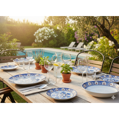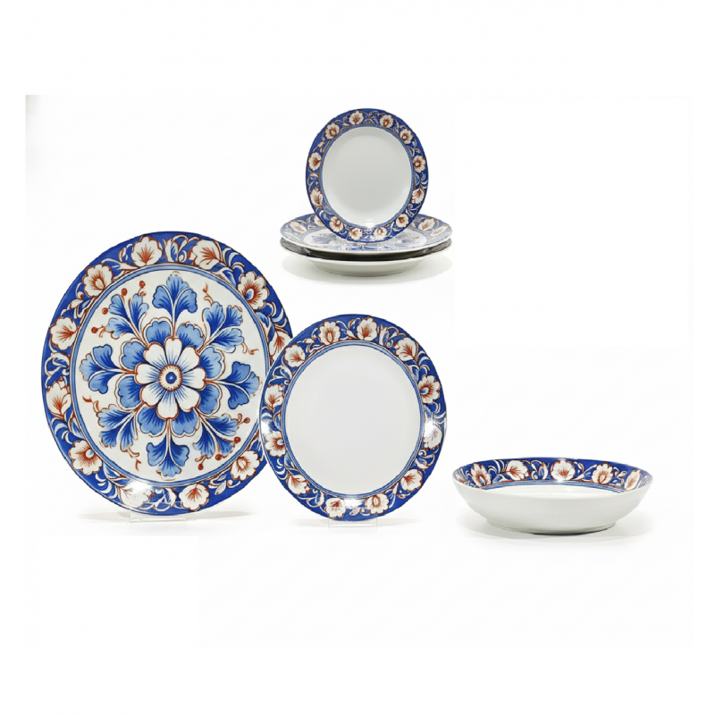 COSEDACASA vi propone un elegante servizio tavola Corinzia da 18 pezzi in porcellana decorata, caratterizzato da raffinati motivi floreali nei toni del blu, bianco e terracotta.