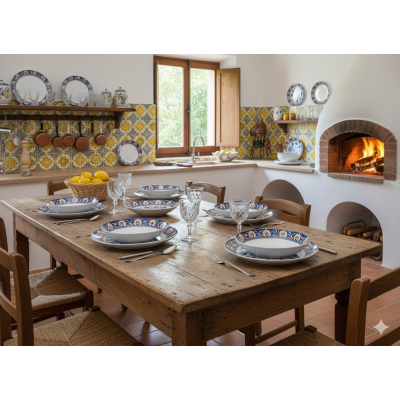 La decorazione floreale, nei toni del blu e terracotta su fondo bianco, si ispira alle maioliche tradizionali, rendendo ogni piatto un piccolo capolavoro di stile.