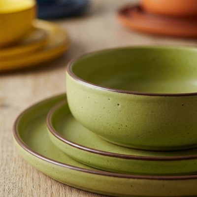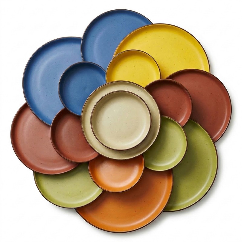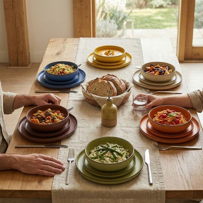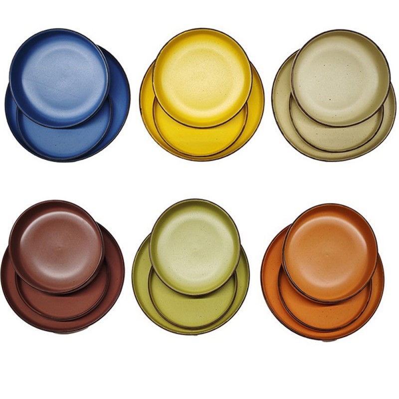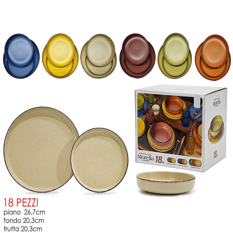 Set completo Morelia da 18 pezzi, perfetto per 6 persone.Composto da sei splendidi colori misti (blu reale, giallo ocra, beige naturale, rosso mattone, verde salvia, arancione terracotta) con finitura stoneware e un elegante bordo scuro.Include 6 piatti piani da 26,7 cm, 6 piatti fondi da 20,3 cm e 6 piatti frutta da 20,3 cm.Realizzato in ceramica stoneware di alta qualità per un design materico e rustico.