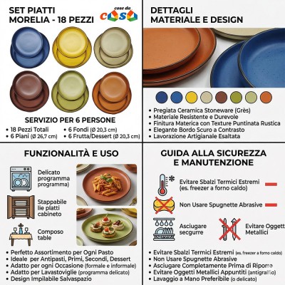 Cose da casa vi propone questo esclusivo set piatti Morelia, una soluzione di stile per una tavola che non passa inosservata. Questo servizio da 18 pezzi per 6 persone è realizzato in pregiata ceramica stoneware (grès), rinomata per la sua durevolezza e la sua finitura materica. Ogni pezzo è caratterizzato da una texture puntinata rustica e da un elegante bordo scuro a contrasto che esalta la lavorazione artigianale. La particolarità di questo set è la vivacità dei suoi sei colori distinti – blu reale, giallo ocra, beige naturale, rosso mattone, verde salvia e arancione terracotta – che vi permetteranno di comporre la vostra tavola in modo sempre nuovo e personale.