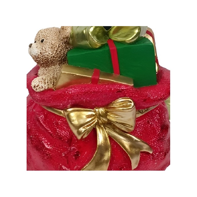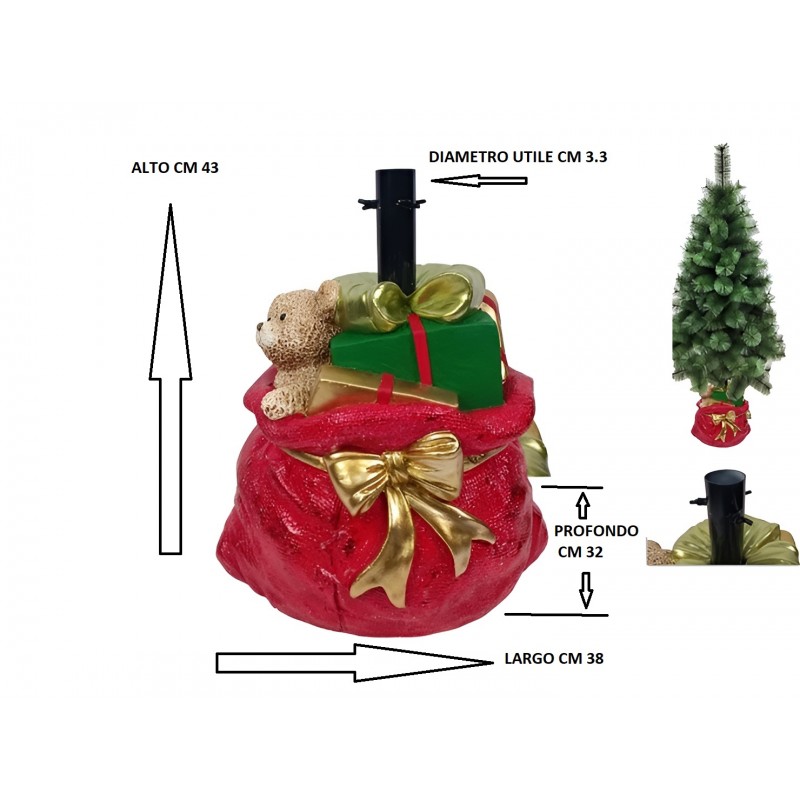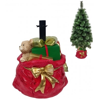 COSEDACASA Vi propone una bellissima base per albero di Natale in vetroresina, dal design originale e decorativo a forma di sacco rosso con pacco regalo verde orsetto e fiocco oro. Un supporto pensato non solo per sostenere l’albero, ma anche per abbellirlo, integrandosi perfettamente con le decorazioni natalizie più raffinate.