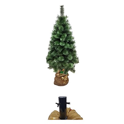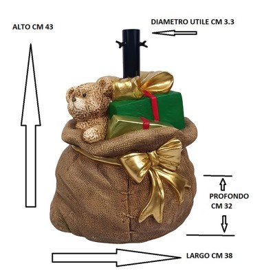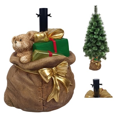 COSEDACASA Vi propone una bellissima base per albero di Natale in vetroresina, dal design originale e decorativo a forma di sacco marrone con pacco regalo verde orsetto e fiocco oro. Un supporto pensato non solo per sostenere l’albero, ma anche per abbellirlo, integrandosi perfettamente con le decorazioni natalizie più raffinate.