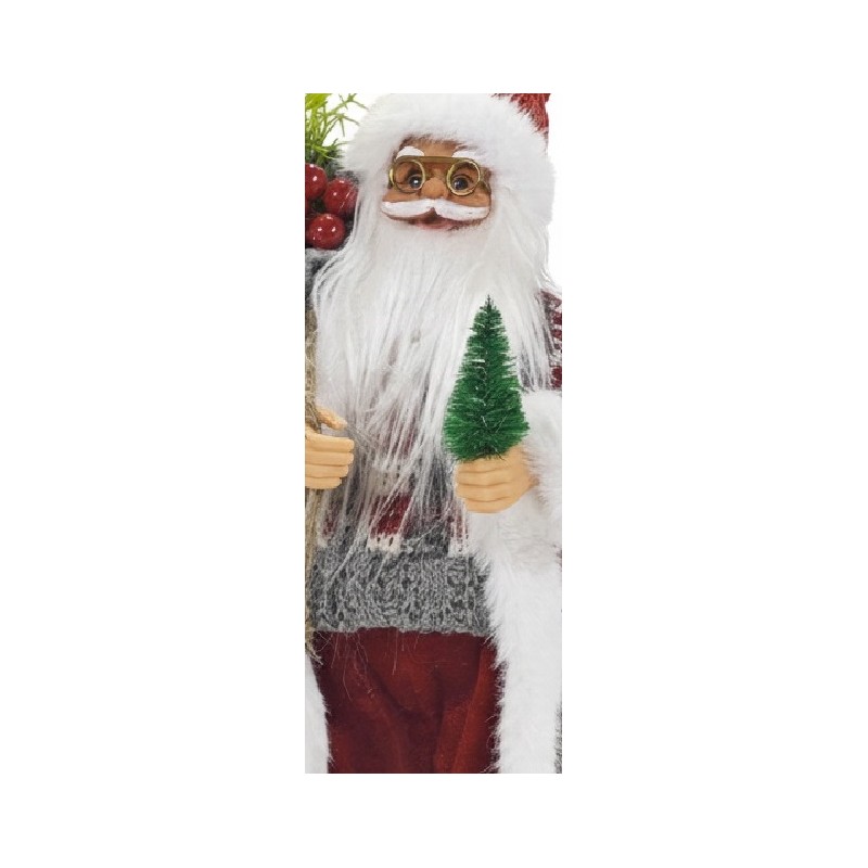 Completa la figura una barba lunga e morbida, occhiali dorati, e un sacco ricco di decorazioni natalizie come rami di pino, bacche e palline argentate.