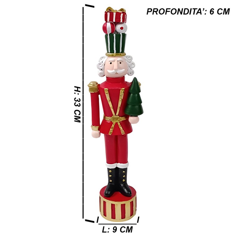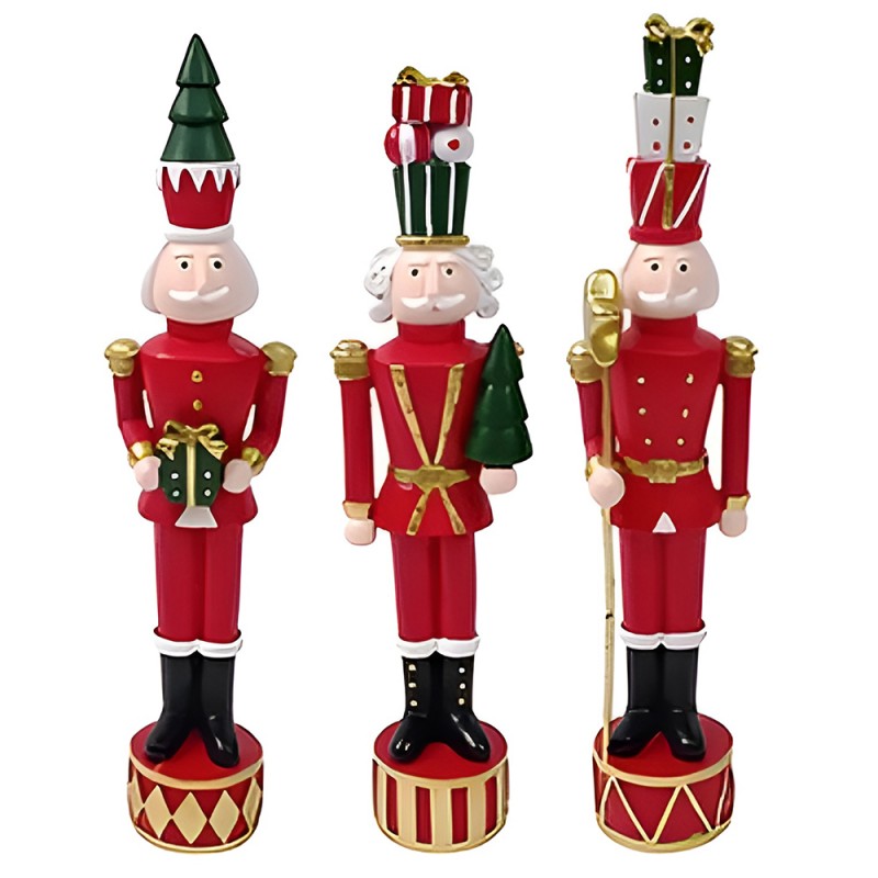 COSEDACASA Vi propone il Set di 3 Soldatini soldato Schiaccianoce Natalizio alto cm 33 decorazioni natalizie in 3 versioni differenti albero di natale e pacchi regalo Il Soldatino Schiaccianone Natalizio con pacchi regalo e albero di natale con scettro, un pezzo unico e colorato per la vostra decorazione natalizia. Questo affascinante soldatino, dipinto a mano con cura nei minimi dettagli. I colori vivaci un'adorabile aggiunta al vostro albero di Natale o alla vostra decorazione festiva.
