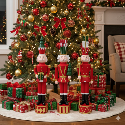 Set di 3 Soldatini soldato Schiaccianoce Natalizio alto cm33 decorazioni natalizie in 3 versioni differenti albero di natale e pacchi regalo Il Soldatino Schiaccianone Natalizio con pacchi regalo e albero di natale con scettro è un affascinante pezzo da collezione alto 33 cm, realizzato in poliresina con colori vivaci.