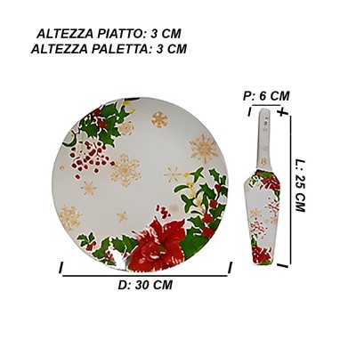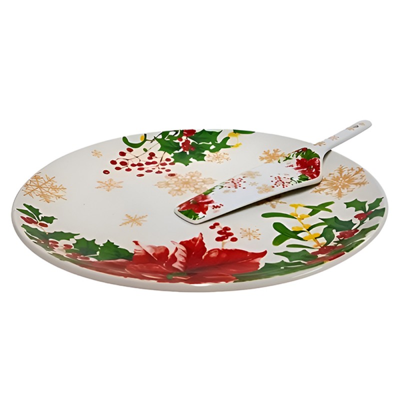 Il piatto ha un diametro di 30 cm e un’altezza di 3 cm, perfetto per accogliere anche dolci di grandi dimensioni. È realizzato in ceramica robusta e smaltata, decorata con cura con motivi natalizi classici: stelle di Natale e agrifoglio in tonalità rosso, verde e dettagli dorati. Il set include anche una paletta in ceramica abbinata, con lo stesso decoro, pensata per un servizio elegante e coordinato.