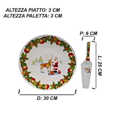 Il piatto ha un diametro di 30 cm e un’altezza di 3 cm, perfetto per accogliere anche dolci di grandi dimensioni. È realizzato in ceramica robusta e smaltata, decorata con cura con motivi natalizi classici: babbo natale e renna in tonalità rosso, verde e dettagli dorati. Il set include anche una paletta in ceramica abbinata, con lo stesso decoro, pensata per un servizio elegante e coordinato.