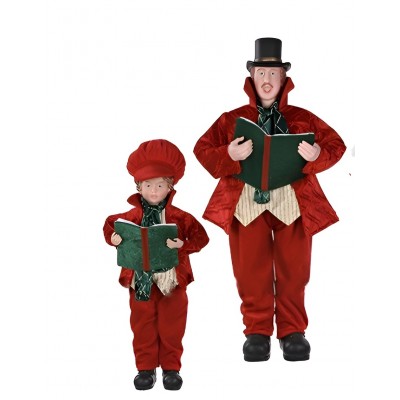 Ogni figura ha una posa e un accessorio diverso: spartiti, cappelli, sciarpe o pellicce sintetiche. I volti e le mani sono scolpiti con espressioni realistiche, mentre i vestiti a quadri rossi, verdi e neri evocano lo stile classico natalizio inglese.