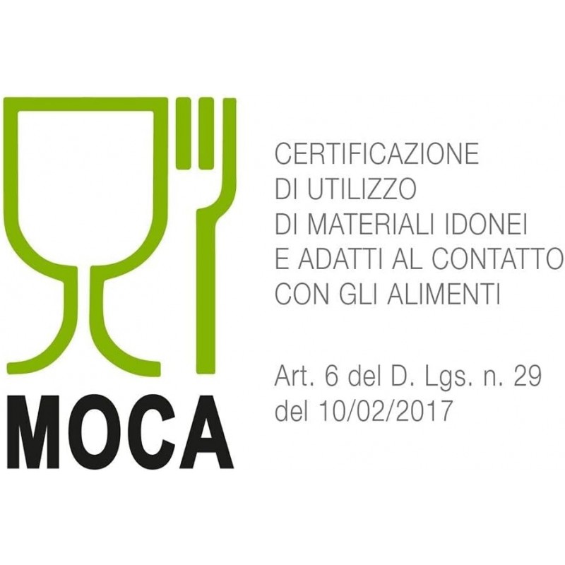 Conforme alle normative: Reg. UE 852/2004, Reg. UE 1935/2004, Reg. UE 10/2011, D.lgs. 2017 n.29, D.lgs. 81/2008, Reg. UE 2023/2006