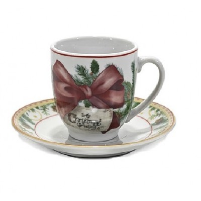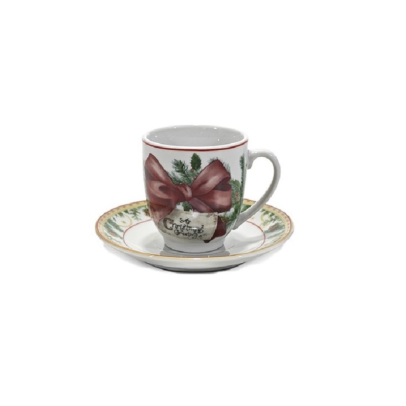 Ogni tazzina è decorata con scene natalizie incantevoli: ghirlanda fiocco rosso agrifoglio pigne palline e altri addobbi che richiamano lo spirito della festa. Il design è curato in ogni dettaglio, con colori vivaci e brillanti stampati su una porcellana bianca elegante.