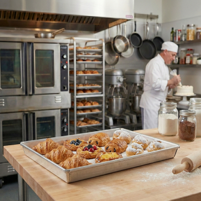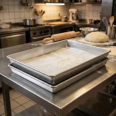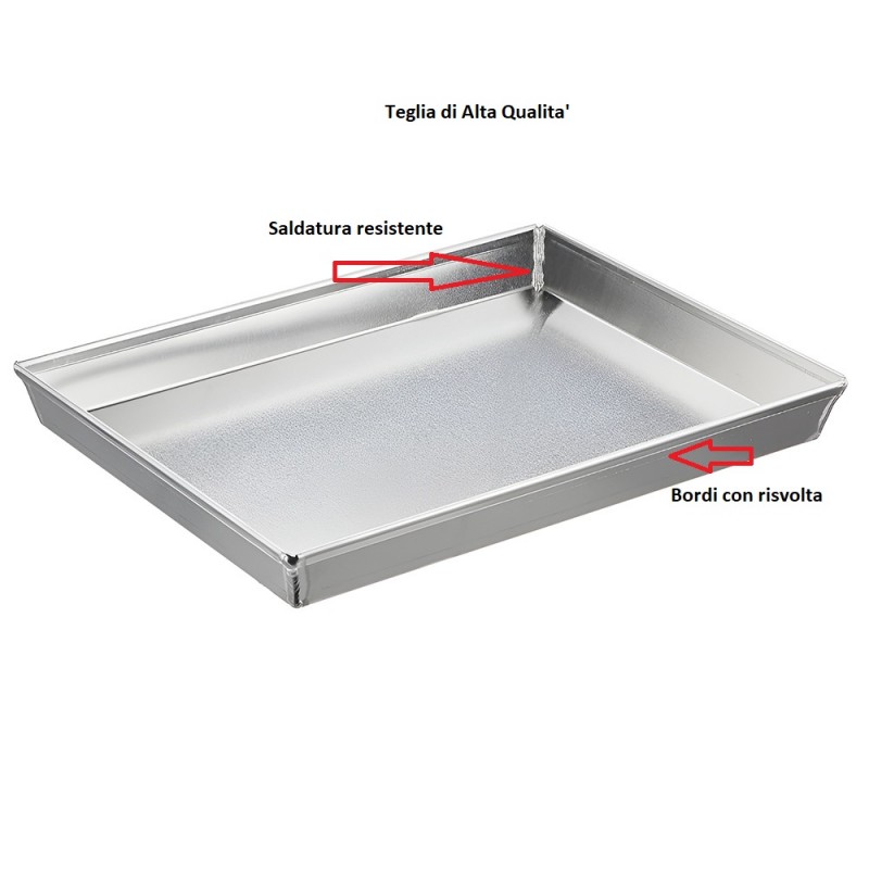 Set da 2 teglie,Questa teglia rettangolare professionale è realizzata in lega di alluminio puro al 99,5% (lega 3003), garantendo una distribuzione del calore impeccabile per cotture uniformi.