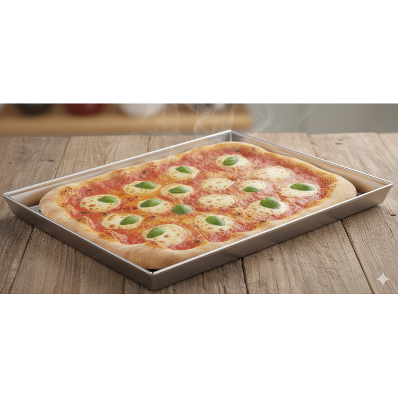 Dal punto di vista strutturale, la teglia presenta bordi ripiegati che ne rinforzano il perimetro, prevenendo le torsioni dovute agli sbalzi termici. Le saldature sono eseguite con tecnologie d'avanguardia per garantire superfici lisce, igieniche e prive di punti deboli. Il design a bordi verticali di 3 cm è ideale per contenere lievitati che necessitano di una crescita guidata e precisa.