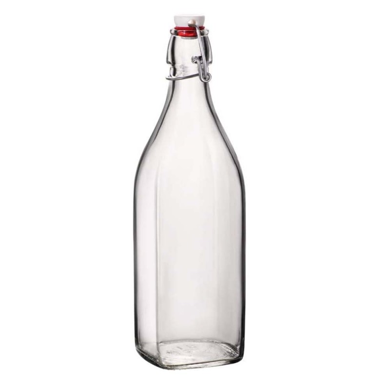Bottiglia Bormioli Rocco Swing da 1000 ml in vetro trasparente di alta qualità con pratica chiusura ermetica a leva. Caratterizzata da una forma rettangolare moderna, misura 31.5 cm in altezza e 8.2 cm in larghezza, ideale per conservare liquidi in modo sicuro. Prodotto resistente, trasparente e adatto al lavaggio in lavastoviglie per la massima igiene quotidiana.