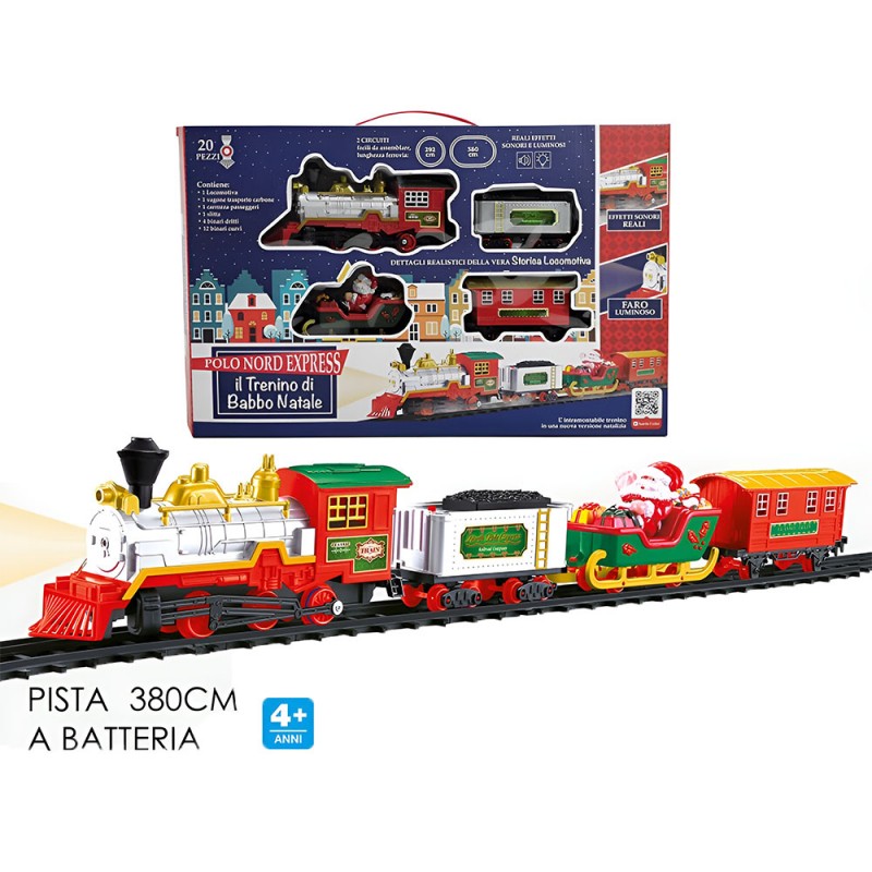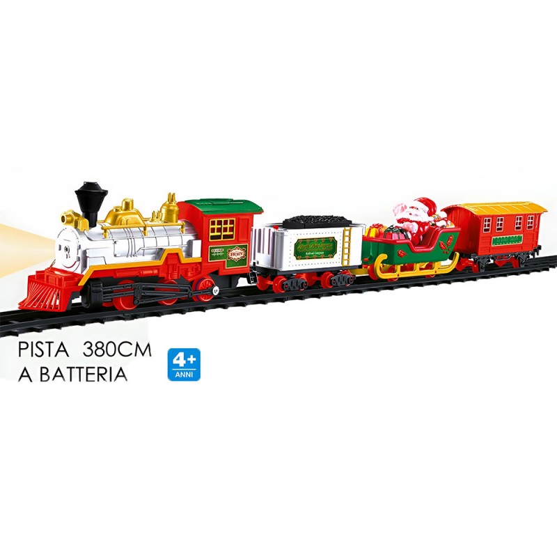 il fantastico Trenino di Babbo Natale – Polo Nord Express, completo di slitta, pista componibile da 380 cm, effetti luminosi e sonori realistici, alimentato a batterie (tipo AA – non incluse). Un'idea perfetta per creare un'atmosfera festosa, allegra e coinvolgente durante il periodo natalizio.
