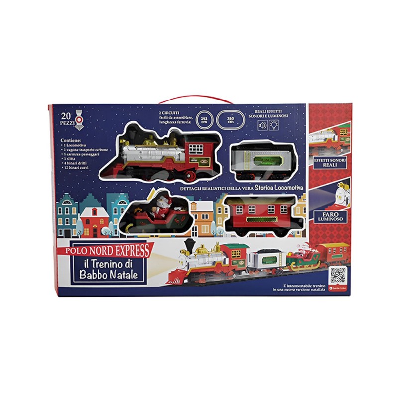 Il set comprende trenino con locomotiva, carrozza e slitta di Babbo Natale, binari componibili, effetti sonori e luminosi, per un viaggio natalizio indimenticabile.