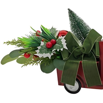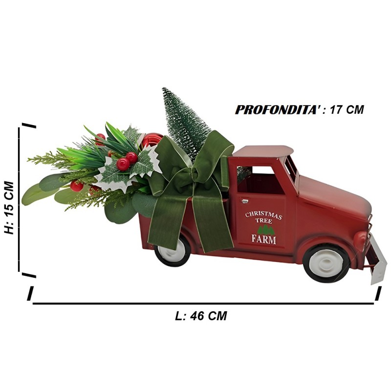 COSEDACASA vi propone un’originale decorazione natalizia dal fascino vintage: un furgoncino rosso in latta dallo stile retrò che trasporta nel cassone una composizione natalizia artigianale con muschio sintetico, bacche rosse, agrifoglio decorativo, e un elegante fiocco verde in tessuto.