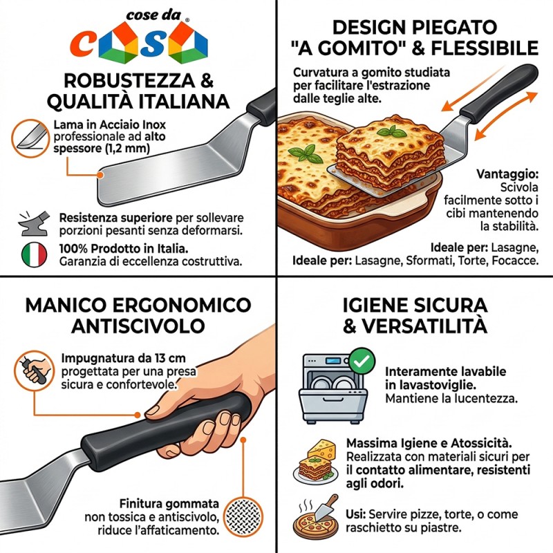 La forma piegata "a gomito" è studiata specificamente per facilitare l'estrazione delle pietanze dalle teglie alte, permettendo un servizio impeccabile di lasagne, sformati, focacce o dolci. Il manico lungo 13 cm è il risultato di uno studio ergonomico avanzato: la finitura gommata antiscivolo offre una presa facile e sicura, riducendo l'affaticamento della mano anche durante utilizzi intensivi in ambito professionale. Il materiale del manico è completamente atossico e progettato per resistere alle alte temperature della lavastoviglie.