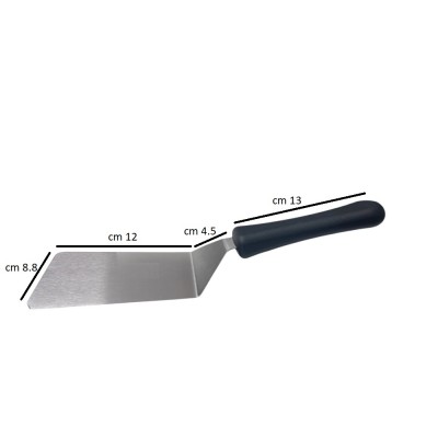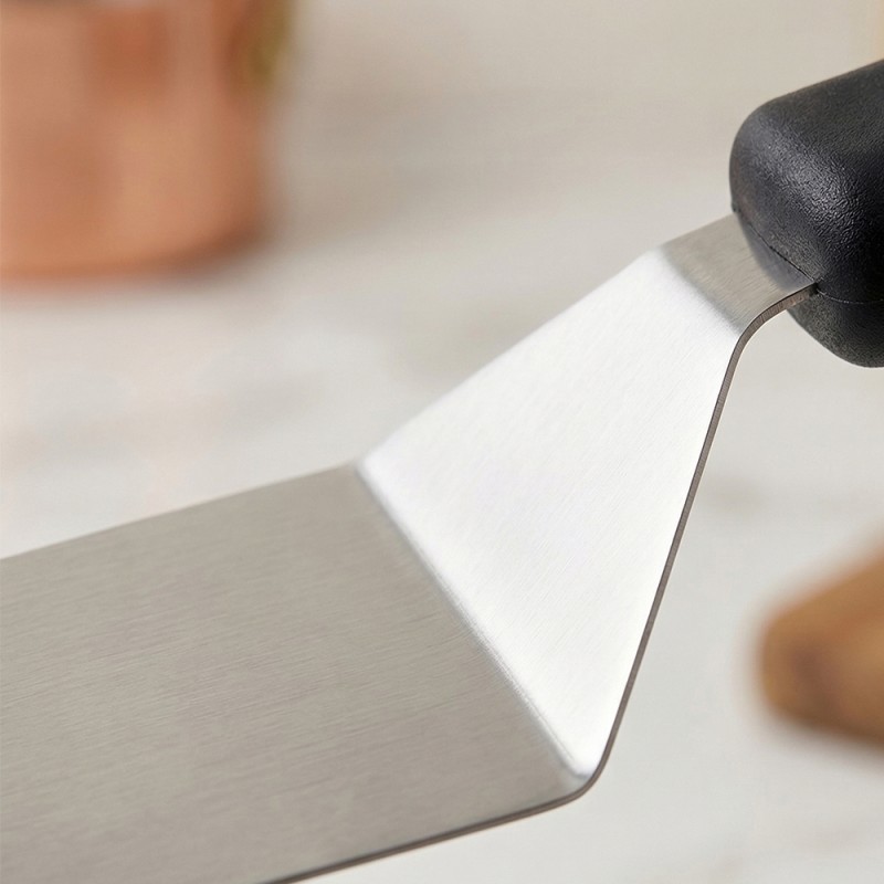 La spatola è ideale per servire piatti pronti e gestire impasti flessibili. Grazie alla sua flessibilità, può essere usata anche in pasticceria per stendere creme o sollevare dischi di pan di spagna. Per una manutenzione ottimale, si consiglia di non utilizzare spugne abrasive sulla lama in acciaio per evitare graffi superficiali e di asciugare bene dopo il lavaggio per prevenire macchie d'acqua.
