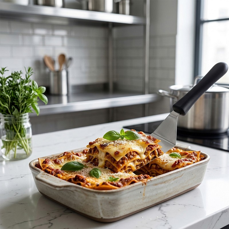 Cose da casa vi propone... una spatola professionale per lasagna progettata per unire robustezza e flessibilità in un unico strumento indispensabile in cucina. Realizzata interamente in Italia, questa spatola vanta una lama in acciaio inox con uno spessore di 1,2 mm, che assicura la stabilità necessaria per sollevare porzioni pesanti senza deformarsi, pur mantenendo la flessibilità ideale per scivolare sotto i cibi.