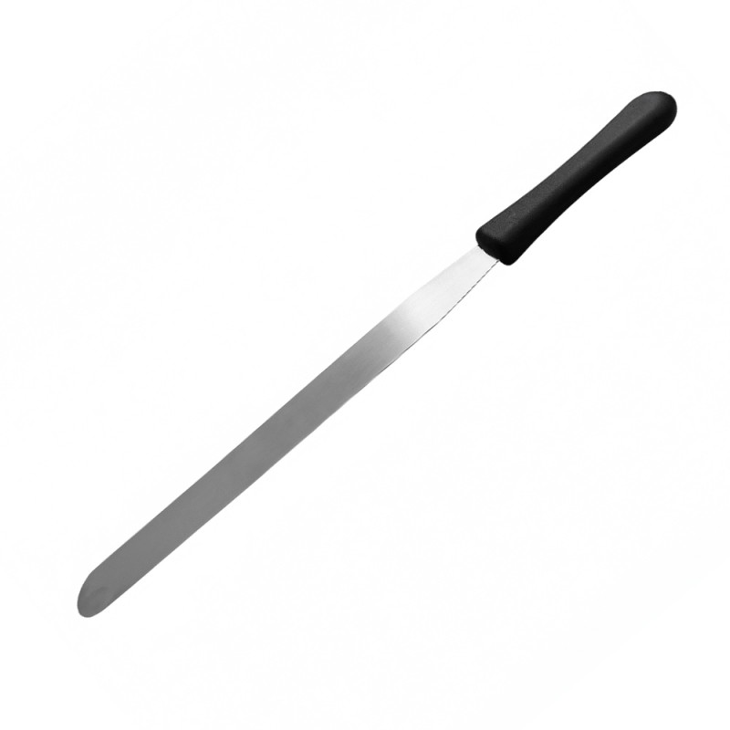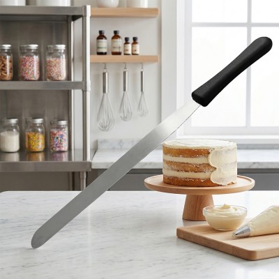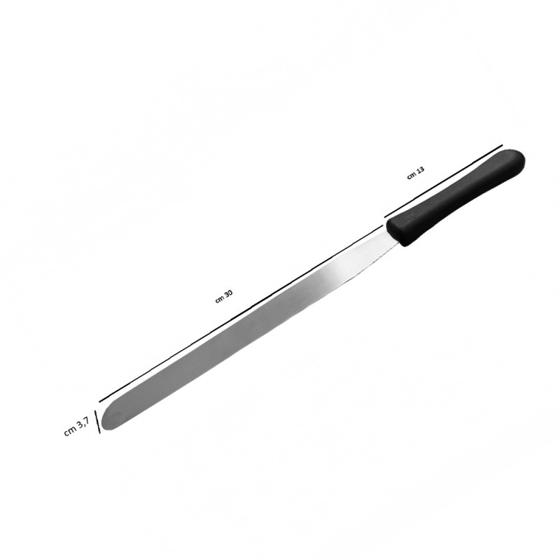 La lama, realizzata in solido acciaio inox con uno spessore di 1,2 mm, offre il perfetto equilibrio tra flessibilità e resistenza. La sua particolare forma dritta permette di stendere creme, glasse e ganache con estrema facilità, evitando che le dita tocchino la superficie del dolce. Grazie alla lunghezza della parte metallica di 30 cm, è possibile lavorare su torte di grandi dimensioni con movimenti fluidi e precisi.