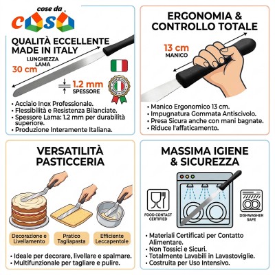 Cose da casa vi propone una spatola da pasticceria professionale progettata per soddisfare le esigenze dei maestri pasticceri e degli appassionati di cucina più esigenti. Questo utensile si distingue per la sua eccezionale qualità costruttiva, essendo prodotto interamente in Italia con i migliori standard produttivi.