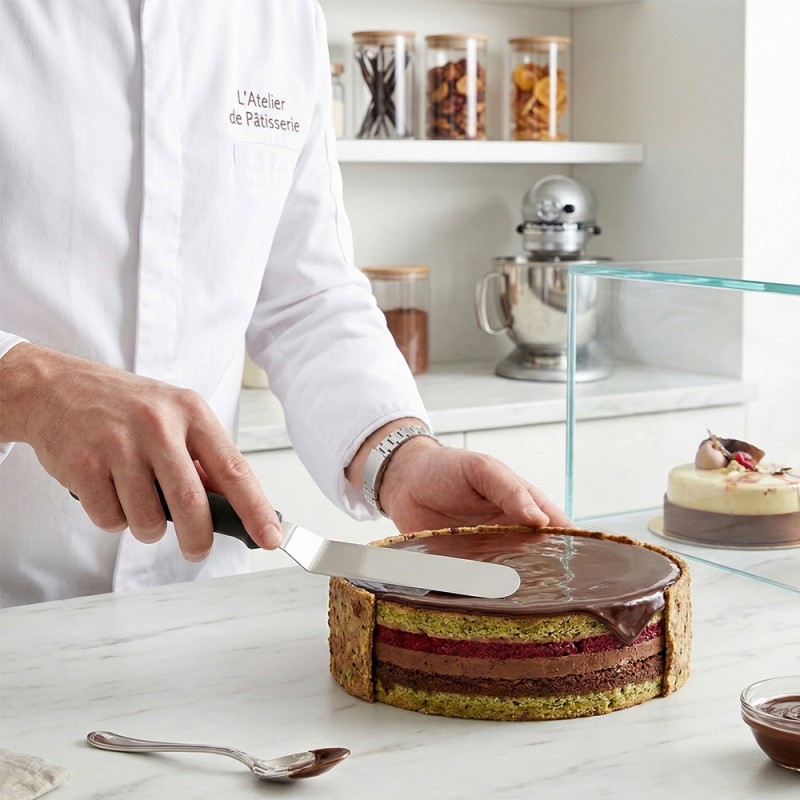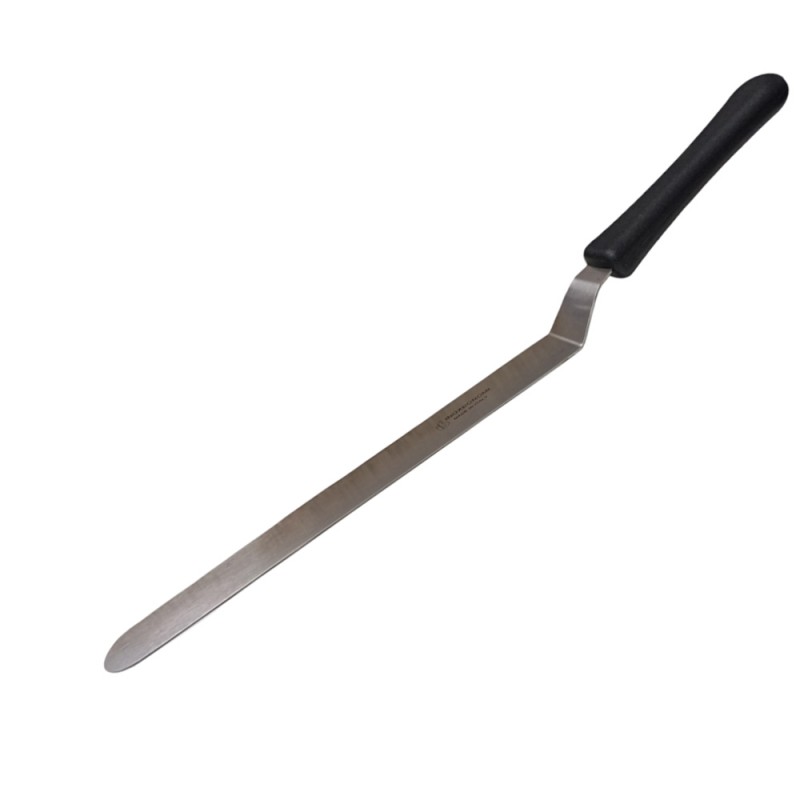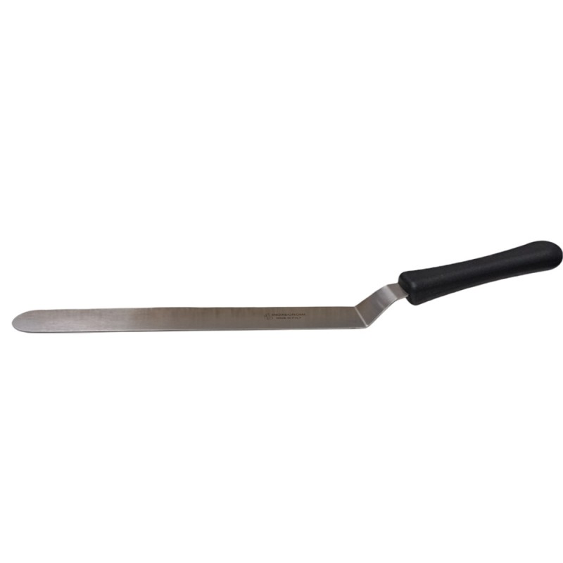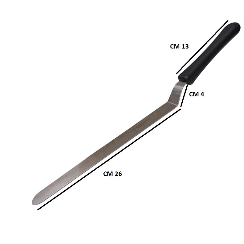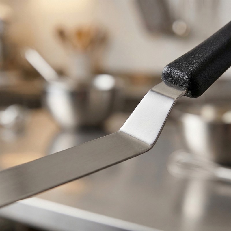 La lama, realizzata in solido acciaio inox con uno spessore di 1,2 mm, offre il perfetto equilibrio tra flessibilità e resistenza. La sua particolare forma piegata (a gomito) permette di stendere creme, glasse e ganache con estrema facilità, evitando che le dita tocchino la superficie del dolce. Grazie alla lunghezza della parte metallica di 30 cm, è possibile lavorare su torte di grandi dimensioni con movimenti fluidi e precisi.