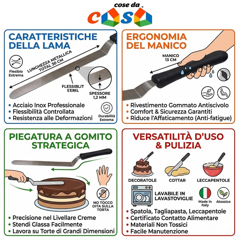 Cose da casa vi propone una spatola da pasticceria professionale progettata per soddisfare le esigenze dei maestri pasticceri e degli appassionati di cucina più esigenti. Questo utensile si distingue per la sua eccezionale qualità costruttiva, essendo prodotto interamente in Italia con i migliori standard produttivi.