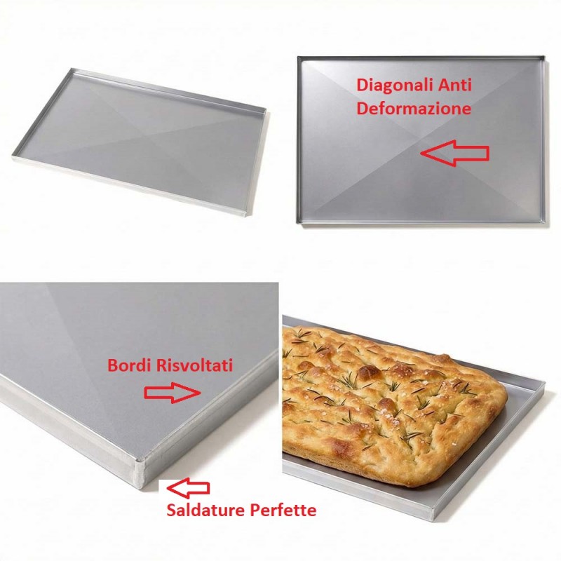 Verranno spedite 2 teglie come descritto:Questa teglia forno professionale rettangolare 65x45 cm è realizzata in pregiata lega di alluminio 3003 Made in Italy, garanzia di eccellente conducibilità termica. Caratterizzata dal fondo con lavorazione diamantata per prevenire deformazioni e bordi dritti alti 2 cm, assicura una cottura omogenea e croccante per pizze, focacce e prodotti di pasticceria.